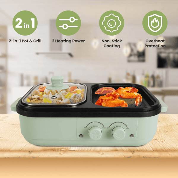Home > 2-in-1 Electric Hot Pot & Grill Combo, Dual Separate Temperature Control, Non-Stick Die-Cast Aluminum, Overheat Protection