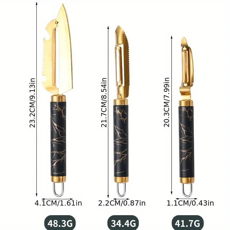This premium stainless steel peeler set combines three essential kitchen tools in one durable, ergonomic design. Featuring ultra-sharp 420J2 stainless steel blades, it effortlessly handles fruits, vegetables, fish scales, and corn kernels while resisting corrosion.