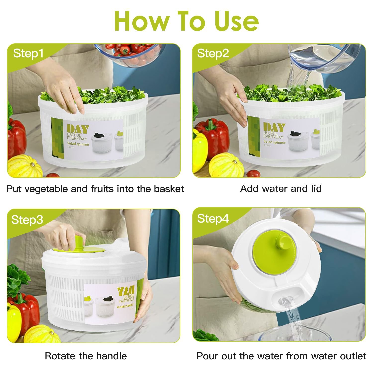*Healthy Lifestyle*:Compared to hand washing,our salad spinner allows you to enjoy cleaner,safer and healthier food. Complete washing and drying in the basket,no need to worry about spraying water all around the kitchen countertop.